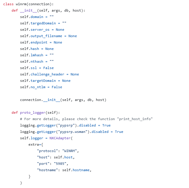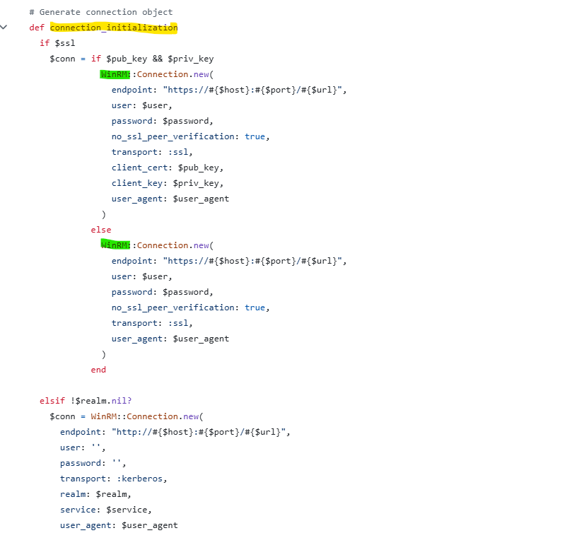 and I found this connection_initialization function, which is the one connecting to the server, where I found the WinRM library referenced with its connection function