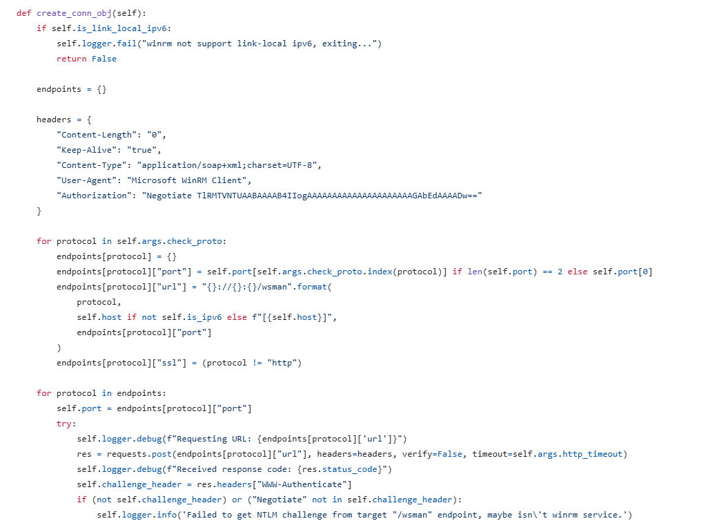 But our focus starts from this create_conn_obj() function, which starts the ntlm negotiation, but it is not completing it, it just does that to discover if winrm is even reachable and we have permission to reach winrm, so nothing interesting here since this is not the full authentication check