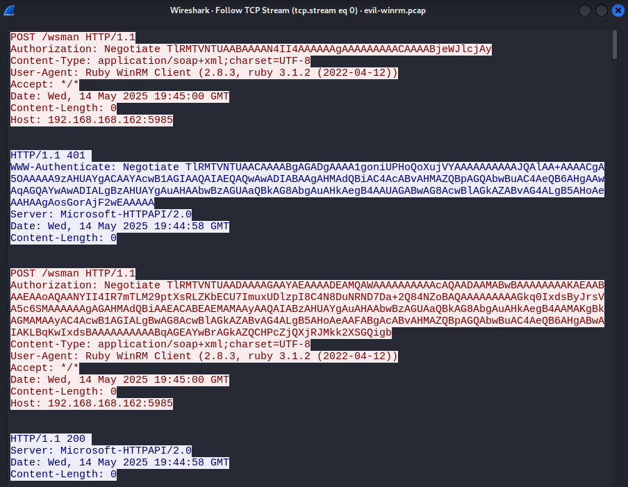 What’s interesting is that evil-winrm and the script I created which uses the same libs used by evil-winrm that’s why we got the same results 200 response from the server after the 3 stages on the NTLM authentication.