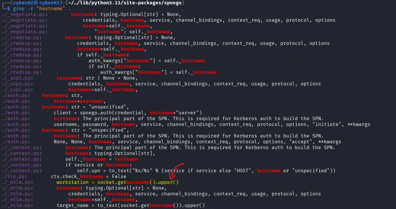 I tried removing netexec modules, to isolate the issue, then I tried searching for socket.gethostname() which is the function getting the hostname of my local pc, I started tracing it from netexec module, to pysrp and reached spnego!