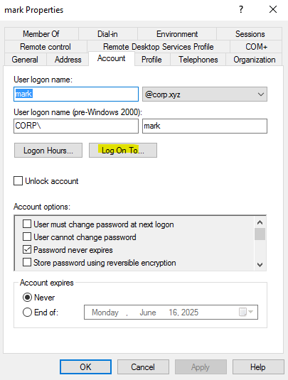 Restriction: mark is restricted to log on only to DC01.